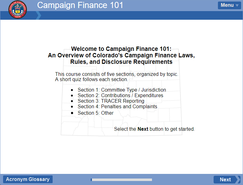 To take this free online course, you must register an account with the Secretary of State’s Learner Community website and select the Campaign Finance 101 class from the course catalog. This course provides a basic overview of campaign finance laws and rules governing the political activity of candidates and committees in Colorado. This course introduces you to the basic types of committees one can register in Colorado, how candidates and committees report contribution and expenditure information, where to file campaign finance reports, and an overview of the penalty and the complaint process in Colorado. We hope this course provides a solid foundation for those interested in learning more about campaign finance disclosure in Colorado.
